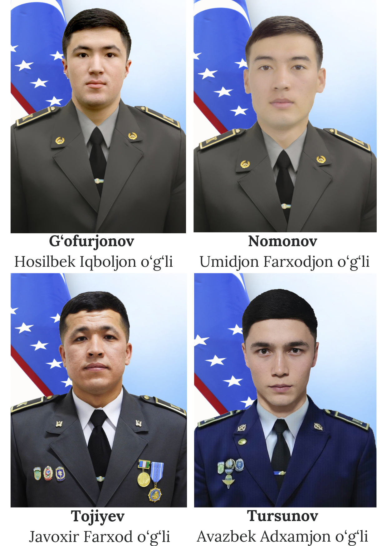 1. G‘OFURJONOV Hosilbek Iqboljon o‘g‘li – Harbiy xavfsizlik va mudofaa universiteti kursanti;